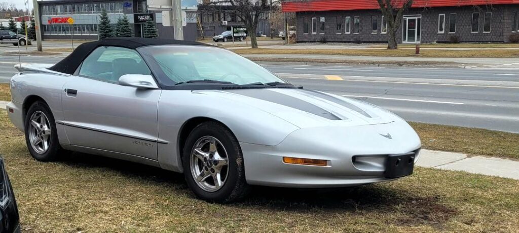My ’95 T-top Firebird I found at a Garage Sale. It has the 3.4 liter V6 w/auto transmission. It has 160,000 kms on it. It has never been winter driven and the t-tops have never leaked. There is virtually no rust anywhere including the underbody of the car. It is pretty much all original except for the rims/tires, Pioneer stereo with Harmon Kardon speakers, an aftermarket tach., upgraded front brakes, an aftermarket security system w remote start, and a K&N air filter The sunvisors and headliner were just redone by Barkey Upholstery (Orillia) in November 2022 before she was put too bed for the winter. It is not a quick car but she cruises really nice and gets lots of great comments. Great gas mileage too!! I decided to buy this car, as the second car I ever owned was a ’70 1/2 Firebird (350 BB/Auto.)and it was so much fun to drive. It was stolen back in 1980.